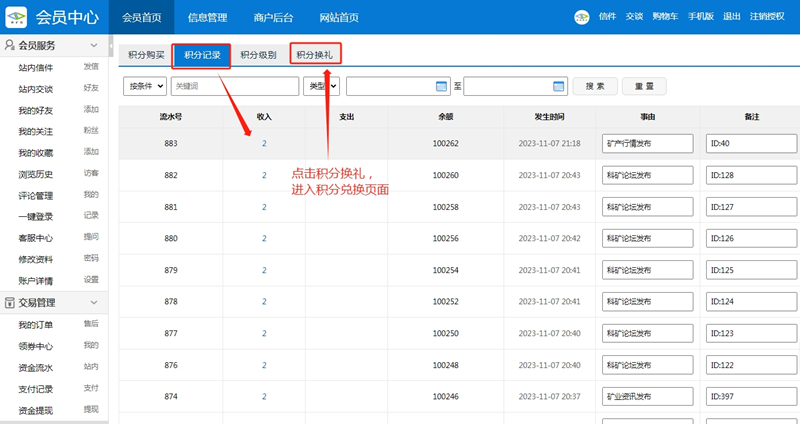 進入積分詳情頁,點擊積分換禮(新注冊會員贈送100積分)