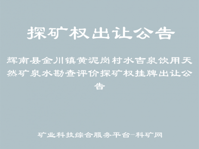受出讓人通化市自然資源局委托,按照自然資源部《礦業(yè)權(quán)出讓交易規(guī)則》(自然資規(guī)〔2023〕1號)等有關(guān)規(guī)定及要求,通化市公共資源交易中心(通化市政府采購中心)對《輝南縣金川鎮(zhèn)黃泥崗村水吉泉飲用天然礦泉水勘查評價》探礦權(quán)以掛牌方式進行出讓?,F(xiàn)將有關(guān)事宜公告如下: