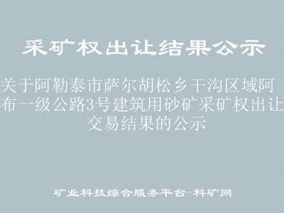 2024年1月4日,阿勒泰地區(qū)采礦權(quán)出讓(ADKYQ〔2023〕17號(hào))公告阿勒泰市薩爾胡松鄉(xiāng)干溝區(qū)域阿布一級(jí)公路3號(hào)建筑用砂礦采礦權(quán)在阿勒泰地區(qū)公共資源交易平臺(tái)以掛牌方式出讓成交。根據(jù)《礦業(yè)權(quán)出讓交易規(guī)則》等有關(guān)規(guī)定,現(xiàn)將掛牌出讓交易結(jié)果公示如下:
