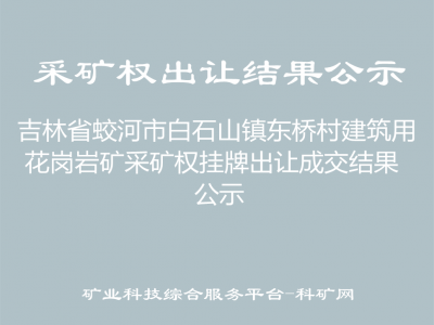 受出讓人蛟河市自然資源局委托,于2024年01月2日至2024年01月16日,在吉林省公共資源交易一體化平臺(tái)對(duì)吉林省蛟河市白石山鎮(zhèn)東橋村建筑用花崗巖礦采礦權(quán)進(jìn)行掛牌出讓,現(xiàn)將成交結(jié)果公示如下: