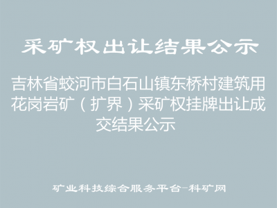 受出讓人蛟河市自然資源局委托,于2024年01月12日至2024年01月16日,在吉林省公共資源交易一體化平臺對吉林省蛟河市白石山鎮(zhèn)東橋村建筑用花崗巖礦采礦權(quán)進行掛牌出讓,現(xiàn)將成交結(jié)果公示如下:
