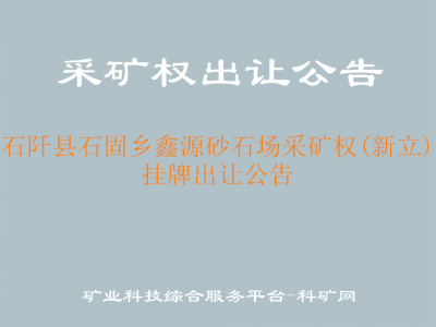 經(jīng)石阡縣人民政府批復(fù)石阡縣自然資源局委托銅仁市公共資源交易中心石阡分中心,對(duì)石阡縣石固鄉(xiāng)鑫源砂石場(chǎng)采礦權(quán)(新立)掛牌出讓進(jìn)行網(wǎng)上公開掛牌出讓?,F(xiàn)將有關(guān)事項(xiàng)公告如下: