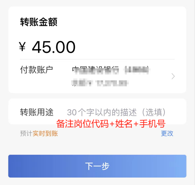 ②繳費(fèi)標(biāo)準(zhǔn)為人民幣45元,少交、多交或重復(fù)繳費(fèi)無(wú)效。繳費(fèi)時(shí)必須備注崗位代碼+姓名+手機(jī)號(hào),如因繳費(fèi)備注信息不全造成考生考試資格無(wú)法確認(rèn),將導(dǎo)致繳費(fèi)無(wú)效。