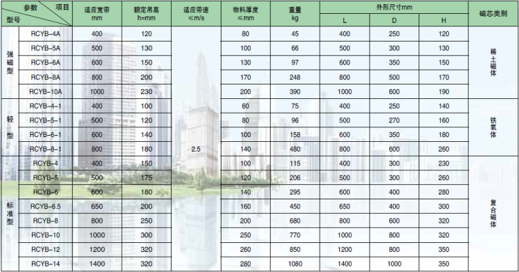 RCYB 系列懸掛式永磁除鐵器內(nèi)部采用高矯頑力,高剩磁的特殊永磁體“釹鐵硼”等材料組成復合磁系。具有免維