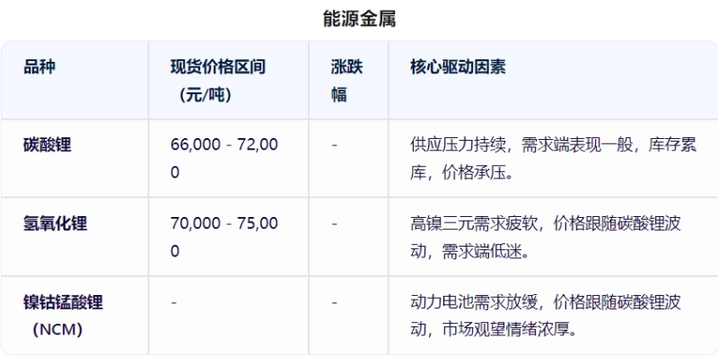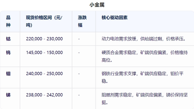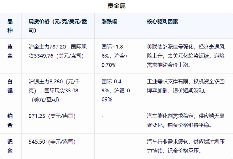 數(shù)據(jù)說(shuō)明:以上數(shù)據(jù)基于2025年4月27日市場(chǎng)行情整理,實(shí)際交易價(jià)格可能因區(qū)域、品質(zhì)及供需關(guān)系存在差異。金屬價(jià)格受全球經(jīng)濟(jì)形勢(shì)、貨幣政策及地緣政治因素影響顯著;貴金屬價(jià)格與美元指數(shù)、避險(xiǎn)情緒密切相關(guān);小金屬及能源金屬價(jià)格受新能源產(chǎn)業(yè)發(fā)展需求驅(qū)動(dòng)。市場(chǎng)有風(fēng)險(xiǎn),決策需謹(jǐn)慎,具體操作請(qǐng)參考實(shí)時(shí)數(shù)據(jù)及專業(yè)機(jī)構(gòu)研報(bào)。