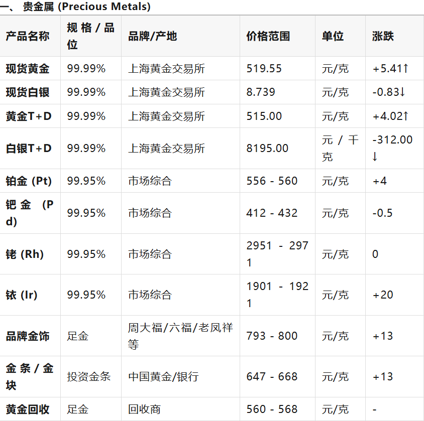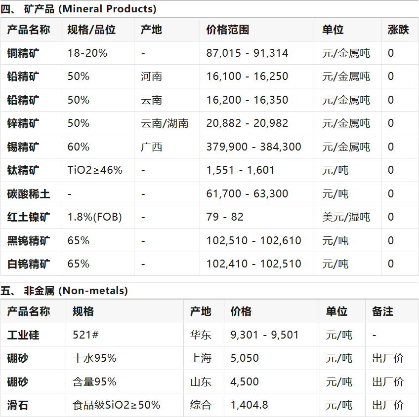 以下價格均為市場參考價,主要來源于上海華通、網(wǎng)易財經(jīng)、金投網(wǎng)等權(quán)威市場信息渠道。 價格單位已統(tǒng)一標注,主要為“元/噸”、“元/千克”或“元/克”。 “漲跌”列中的數(shù)值代表與上一交易日相比的價格變動。 部分稀有金屬和能源金屬的報價以股票指數(shù)形式呈現(xiàn),反映的是市場板塊整體表現(xiàn),而非單一商品價格。