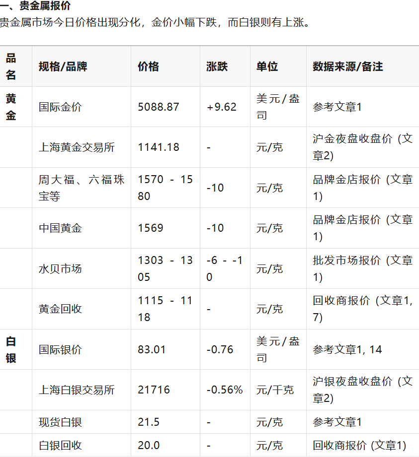 以下價(jià)格信息綜合了多個(gè)信息源,包括現(xiàn)貨市場(chǎng)、期貨交易所和品牌金店,價(jià)格會(huì)因品牌、規(guī)格、產(chǎn)地和交易時(shí)間而異,僅供參考。