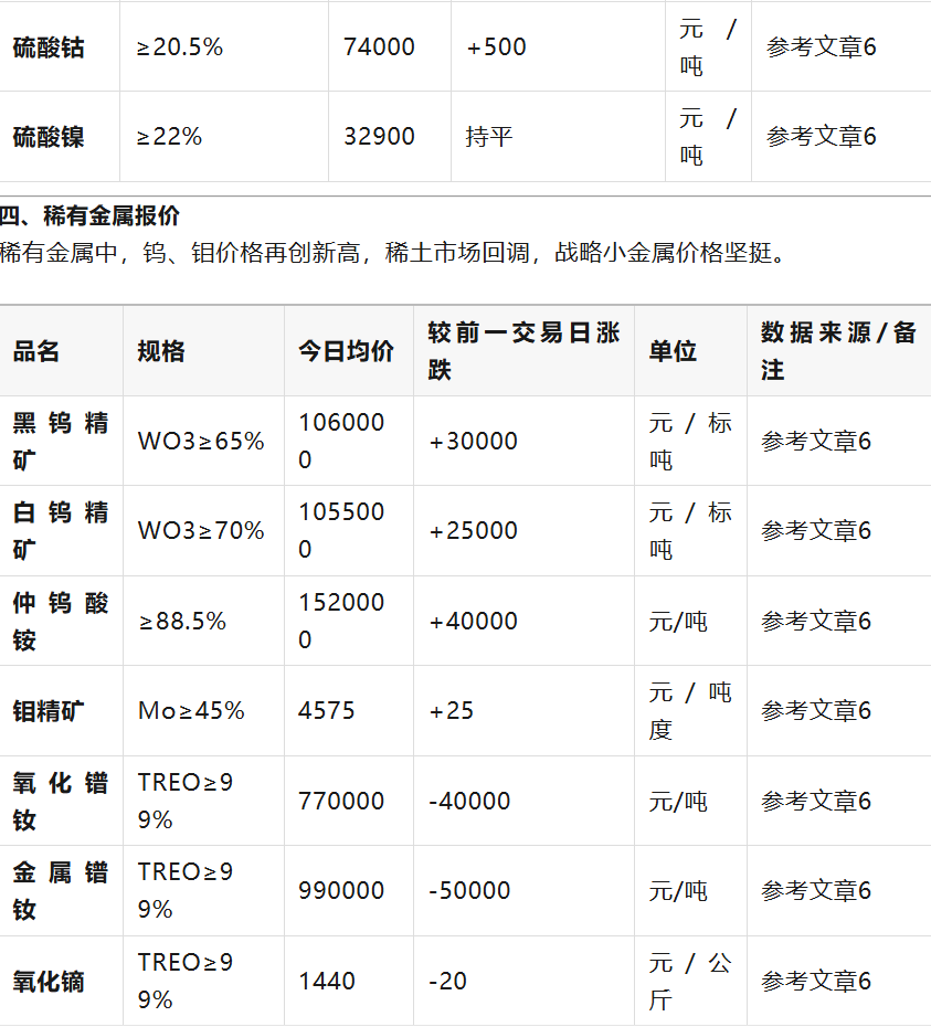 今日市場(chǎng)整體表現(xiàn)分化。貴金屬黃金在沖高后回落,受美元和美債收益率影響承壓?;窘饘僦?,銅價(jià)微跌,但鋁、鋅、鎳等因低庫(kù)存和需求預(yù)期而上漲。稀有金屬鎢、鉬因供給端收縮價(jià)格持續(xù)創(chuàng)新高,而稀土則因下游需求不足出現(xiàn)回調(diào)。 信息獲取建議:
