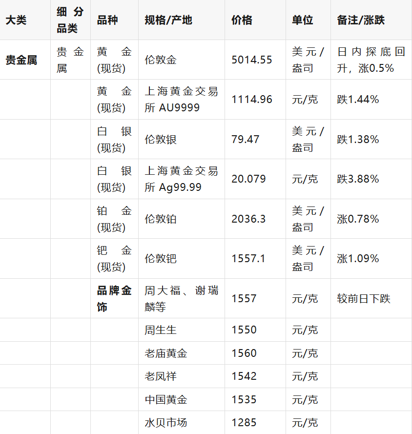 :以下價(jià)格數(shù)據(jù)主要采集于2026年3月16日,部分為當(dāng)日收盤價(jià)或日間結(jié)算價(jià),部分品牌金飾價(jià)格為當(dāng)日?qǐng)?bào)價(jià)。市場(chǎng)行情實(shí)時(shí)變動(dòng),請(qǐng)以最新交易數(shù)據(jù)為準(zhǔn)。