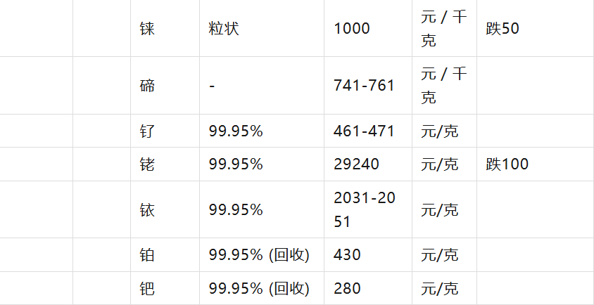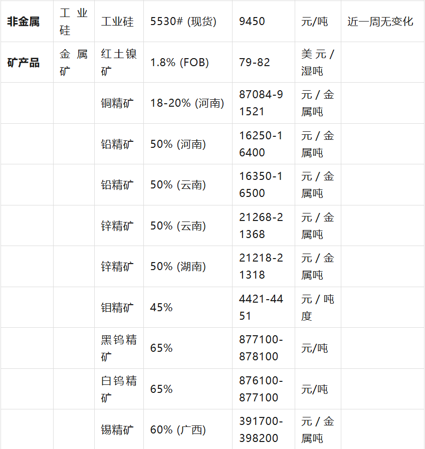 :價(jià)格單位包含元/克、美元/盎司、元/噸、美元/濕噸、元/千克等,請(qǐng)留意表格中的單位。