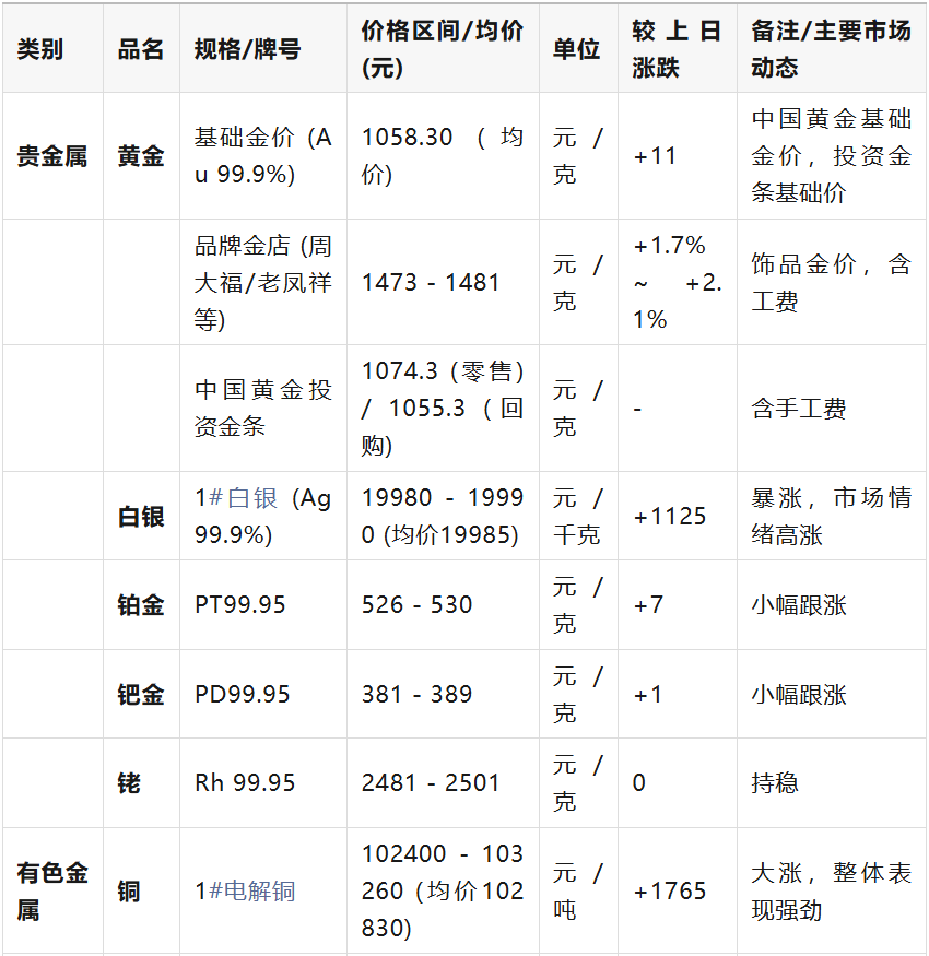 :主要為人民幣(元),并根據(jù)行業(yè)慣例標(biāo)注了單位(如:元/噸、元/克、元/千克)。 價(jià)格類型