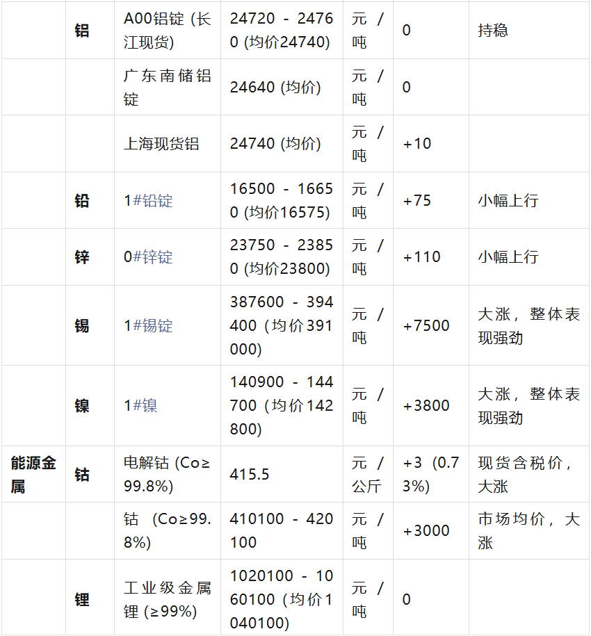 :綜合參考了上海金屬現(xiàn)貨、長(zhǎng)江有色金屬、中色網(wǎng)、同花順財(cái)經(jīng)、東方財(cái)富等多家權(quán)威市場(chǎng)信息平臺(tái)。 價(jià)格單位