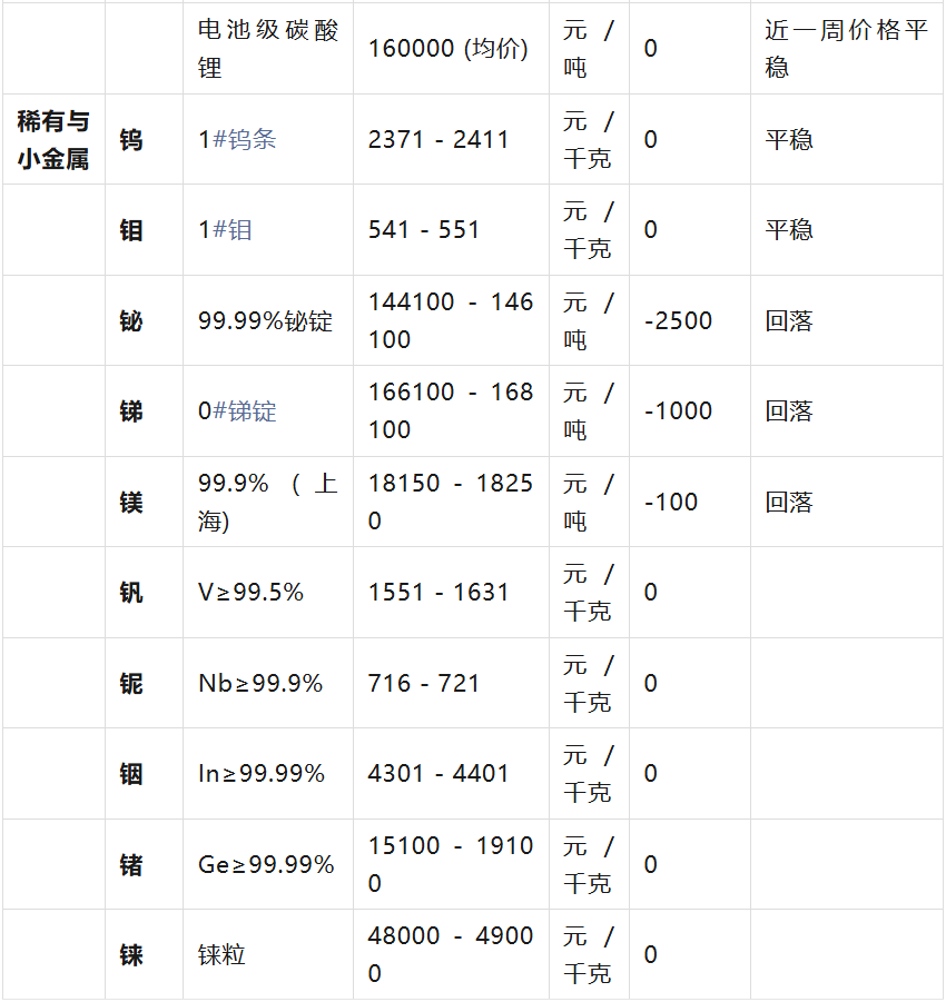 :鈷價(jià)大幅上漲3000元/噸,電解鈷現(xiàn)貨價(jià)格上漲3元/公斤(0.73%)。鋰價(jià)近期保持平穩(wěn)。 部分小金屬回調(diào)
