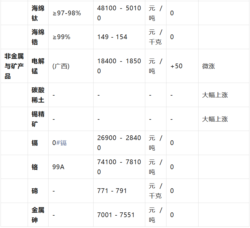 :上游礦產(chǎn)品如錫精礦、碳酸稀土等跟隨下游金屬價(jià)格大幅上漲。