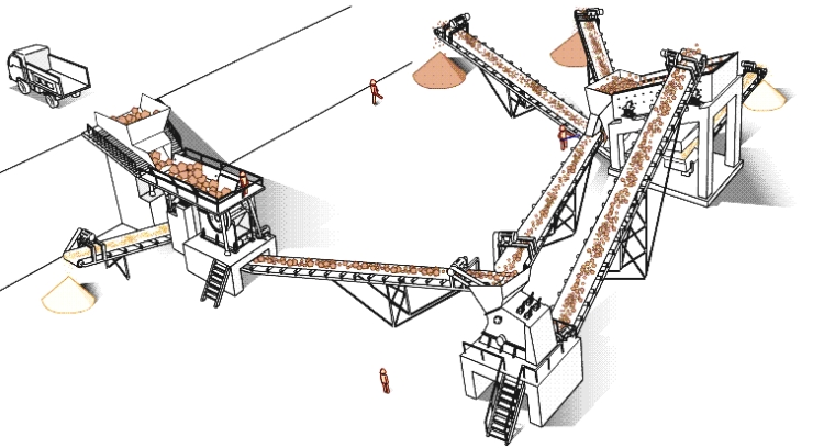 工藝流程包括以下幾個單元:(1)骨料一次破碎和輸送;(2)骨料除土篩分及輸送;(3)骨料二次破碎及輸送;(4)骨料一次篩分及輸送;(5)骨料二次篩分及輸送;(6)骨料成品儲存及發(fā)運(yùn);(7)粉料輸送及散裝;(8)壓縮空氣站及管網(wǎng):(9)稱量系統(tǒng);(10)給水及處理單元;(11)電氣自動化系統(tǒng);(12)備件及維修中心,