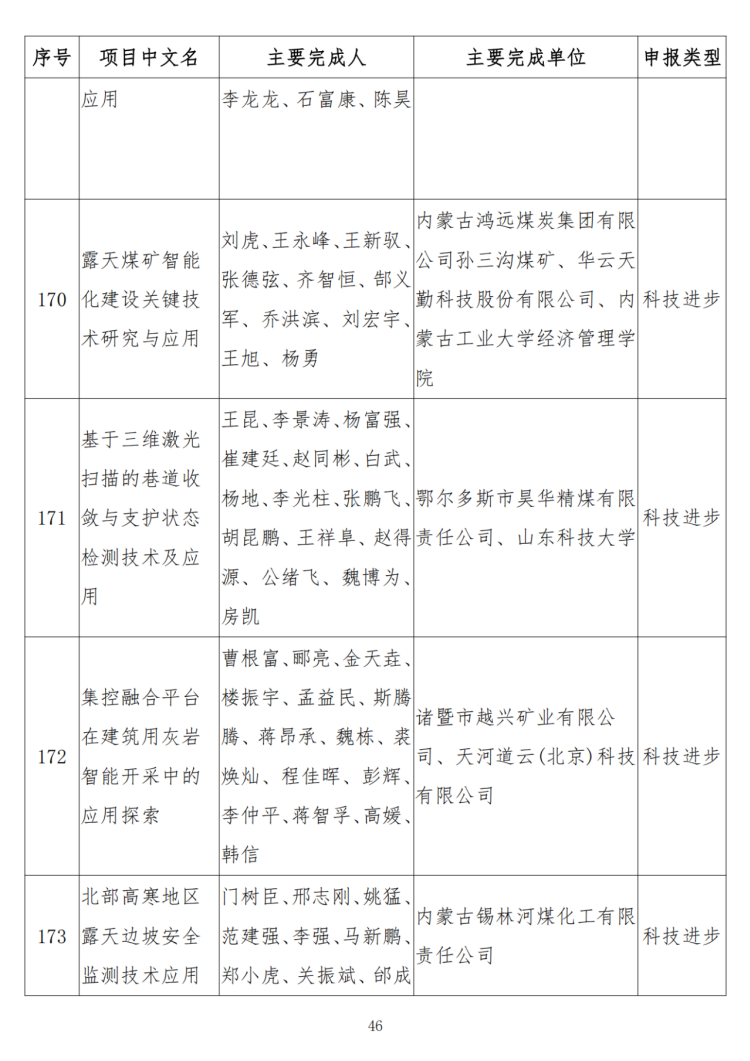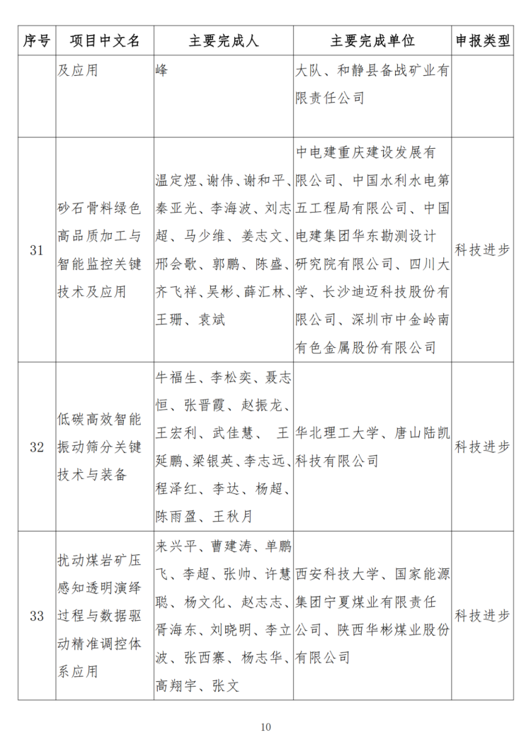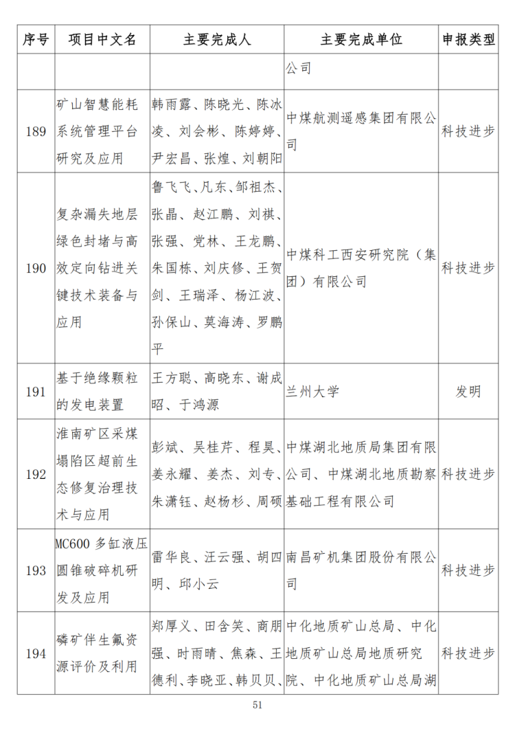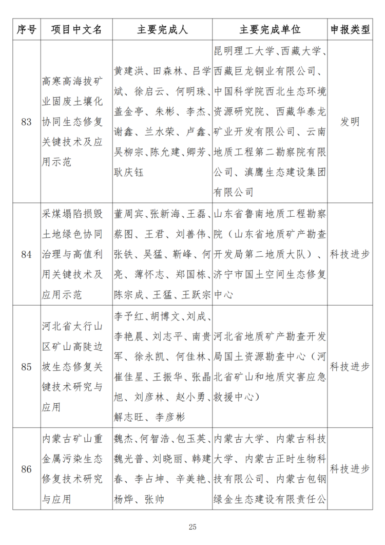 全體會員及各相關(guān)人員:依據(jù)《綠色礦山科學(xué)技術(shù)獎管理辦法》規(guī)定和《關(guān)于申報2024年度綠色礦山科學(xué)技術(shù)獎的通知》的要求,綠色礦山科學(xué)技術(shù)獎勵辦公室對申報綠色礦山科學(xué)技術(shù)獎(國家獎勵辦備案編號0265)的基礎(chǔ)研究、科技進步、發(fā)明(專利)三類獎項通過申報、形式審查、初評、終評、復(fù)核等環(huán)節(jié),確定了235項成果為2024年度綠色礦山科學(xué)技術(shù)獎的擬獲獎項目,現(xiàn)進行公示。一等獎完成人不超過15人、二等獎完成人不超過10人、三等獎完成人不超過5人。對于完成人超過限額的項目,請與綠色礦山科學(xué)技術(shù)獎勵辦公室聯(lián)系。自公示之日起7日內(nèi),任何單位以及個人對擬獲獎名單有異議者,須以本人真實身份以書面形式向綠色礦山科學(xué)技術(shù)獎勵辦公室提出,同時需要提供準(zhǔn)確的相關(guān)材料。凡是匿名異議以及超過公示期內(nèi)提出異議者恕不予受理。特此公示。聯(lián)系方式: 聯(lián)系人:呂老師 15712878741通訊地址:北京市海淀區(qū)學(xué)清路9號匯智大廈B座311室