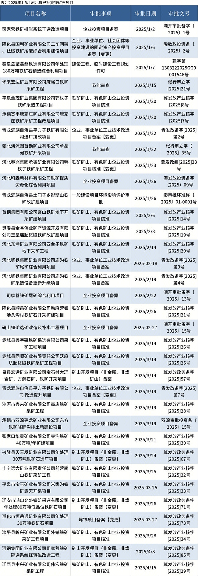 核心提示:據(jù)Mysteel不完全統(tǒng)計(jì),2025年1-5月河北省共批復(fù)鐵礦石相關(guān)項(xiàng)目48個(gè),分別是21個(gè)鐵礦礦山、有色礦山企業(yè)投資項(xiàng)目核準(zhǔn)或【變更】、