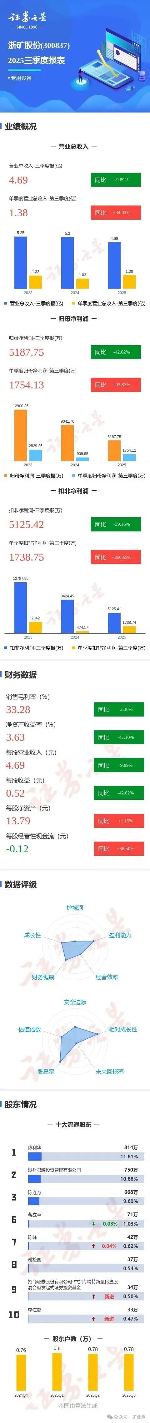 浙礦股份2025年三季報顯示,前三季度公司主營收入4.69億元,同比下降9.9%;歸母凈利潤5187.75萬元,同比下降42.62%;扣非凈利潤5125.42萬元,同比下降39.16%;其中2025年第三季度,公司單季度主營收入1.38億元,同比上升34.02%;單季度歸母凈利潤1754.13萬元,同比上升92.83%;單季度扣非凈利潤1738.75萬元,同比上升266.69%;負債率35.53%,投資收益22.58萬元,財務費用-73.79萬元,毛利率33.28%。