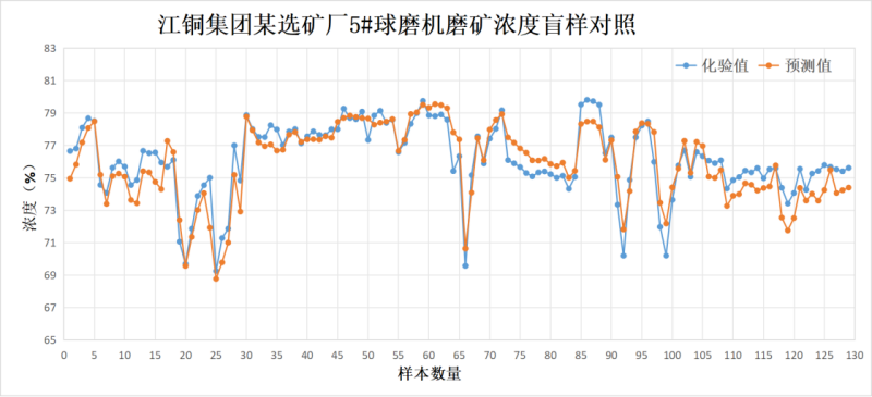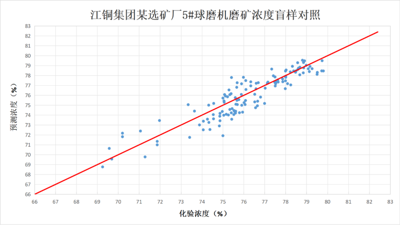 目前,產(chǎn)品已成功落地江銅集團(tuán)某選礦廠、首鋼集團(tuán)某選礦廠等行業(yè)標(biāo)桿企業(yè)。在江銅選礦廠的長(zhǎng)期運(yùn)行數(shù)據(jù)跟蹤中,通過(guò)采集117組盲樣進(jìn)行誤差分析顯示:樣本覆蓋濃度范圍的化驗(yàn)區(qū)間為69.25~79.8%,預(yù)測(cè)區(qū)間為68.77~79.54%,盲樣總體標(biāo)準(zhǔn)偏差達(dá)1.51%,在線預(yù)測(cè)值與化驗(yàn)值相關(guān)性良好(R^2=0.83)。江銅集團(tuán)某冶煉廠、晉南礦業(yè)某選礦廠等合作項(xiàng)目也在穩(wěn)步推進(jìn),未來(lái)將為更多企業(yè)的磨礦工藝升級(jí)提供技術(shù)支撐。