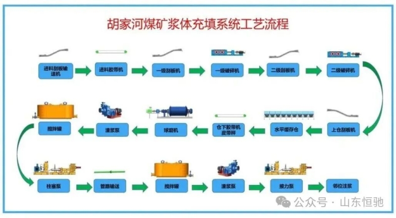 胡家河煤礦井下矸石漿體充填系統(tǒng)主要由齒輥破碎機(jī)、水平矸石倉(cāng)、球磨機(jī)、攪拌罐、充填泵等設(shè)備構(gòu)成,采用2臺(tái)工業(yè)充填泵串聯(lián)接力泵送高濃度矸石漿體,輸送距離達(dá)5500米。