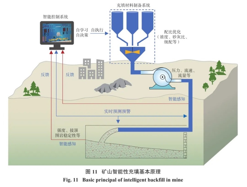2.4.2 智能充填控制智能充填控制是具有智能信息處理、智能信息反饋和智能控制決策的控制方式。將物聯(lián)網(wǎng)、云計算、大數(shù)據(jù)、人工智能、自動控制、移動互聯(lián)網(wǎng)、機器人裝備等與現(xiàn)代礦山充填技術(shù)深度融合,使充填過程中的攪拌、管道輸送等主要充填系統(tǒng)具有自感知、自學習、自決策與自執(zhí)行的基本能力?;谥悄艹涮畈牧夏軐ν獠凯h(huán)境和自身所處環(huán)境進行感知,對充填料漿在管道輸送中的壓力、流速以及流入采空區(qū)后對采空區(qū)環(huán)境(如圍巖穩(wěn)定性、充填料漿在采空區(qū)中的流動特性、接頂情況和充填體的強度等)進行感知,并將所獲信息反饋給控制系統(tǒng)。通過智能控制系統(tǒng)的自學習、自決策來不斷優(yōu)化配比(濃度、砂灰比、級配等),實時調(diào)整,同時能對礦山充填事故進行實時預(yù)測和預(yù)警、快速決策與自處理等,從而避免充填事故發(fā)生,提高充填體穩(wěn)定性和充填效率,降低充填成本和工人勞動強度,實現(xiàn)充填材料攪拌、管道運輸、安全保障等過程的智能化運行,形成礦山全面感知、實時互聯(lián)、分析決策、自主學習、動態(tài)預(yù)測、精準協(xié)同控制的完整智能系統(tǒng),最終實現(xiàn)礦山充填的智能化。礦山智能性充填基本原理如圖11所示。