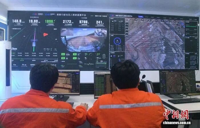 圖為李偉豪(右)和同事在操控無人礦卡。中新網記者 孫亭文 攝