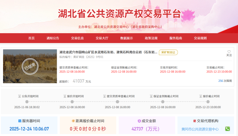 12月23日,湖北武穴市園椅山礦區(qū)水泥用石灰?guī)r、建筑石料用白云巖(石灰?guī)r)礦成功出讓。該項(xiàng)資源儲(chǔ)量超2.82億噸,生產(chǎn)規(guī)模950萬(wàn)噸/年,出讓30年,掛牌起始價(jià)超4.1億元。黃岡亞?wèn)|水泥有限公司報(bào)價(jià)超4.27億元競(jìng)得。