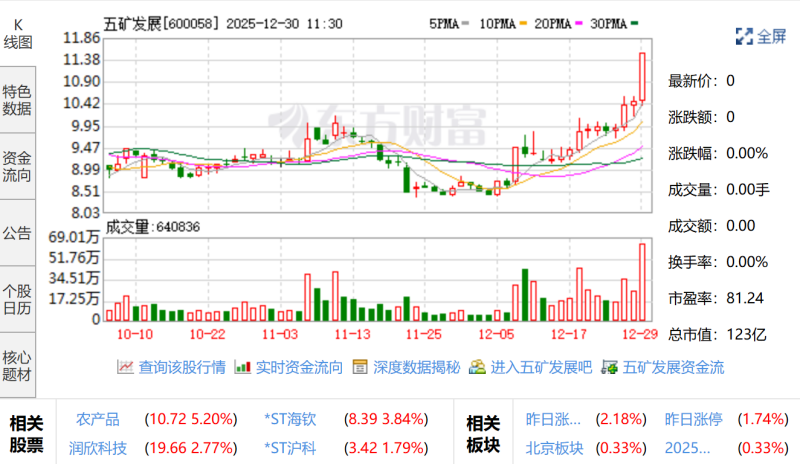 值得一提的是,29日五礦發(fā)展開盤后股價直線拉升,強勢漲停。截至29日收盤時公司最新市值為123.48億元。據公告,五礦發(fā)展將于12月30日(周二)起停牌。