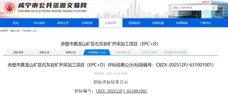 近日,湖北省咸寧市公共資源交易網發(fā)布赤壁市黃龍山礦區(qū)石灰?guī)r礦開采加工項目(EPC+O)評標結果公示。