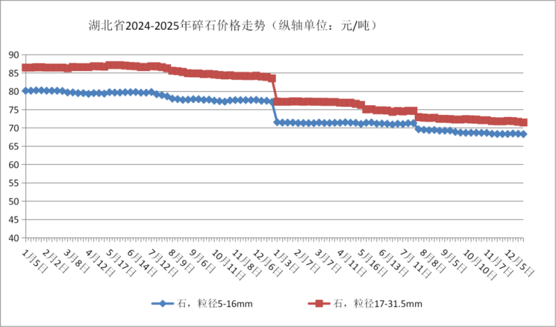 與砂類走勢不同,碎石價(jià)格12月環(huán)比輕微下跌。監(jiān)測的兩種規(guī)格碎石(粒徑5-16mm、17-31.5mm)全省均價(jià)分別為68.39元/噸和71.74元/噸,環(huán)比降幅分別為0.07%和0.22%。同比來看,跌幅更為明顯,均超過11%,顯示碎石市場同比仍處低位運(yùn)行。