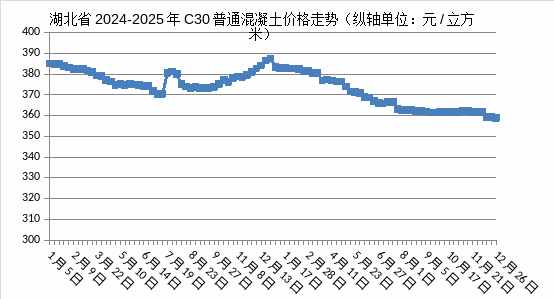 12月,作為下游主要成品,普通混凝土價(jià)格隨原材料價(jià)格下行而同步下跌。強(qiáng)度等級C30普通混凝土全省均價(jià)為359.84元/立方米,環(huán)比下降0.60%,同比下降6.62%。