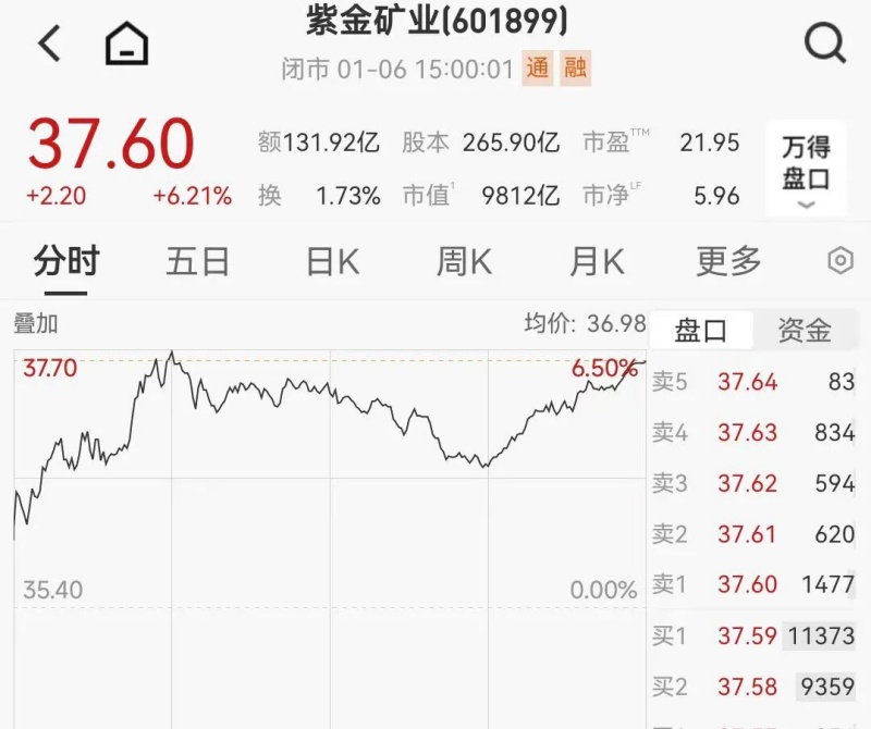 核心提示:1月6日早盤,紫金礦業(yè)漲幅達(dá)到6.5%,總市值首破1萬億元。A股市值排名升至13位的同時,也超越了力拓(1月5日美股收盤市值9499.2億