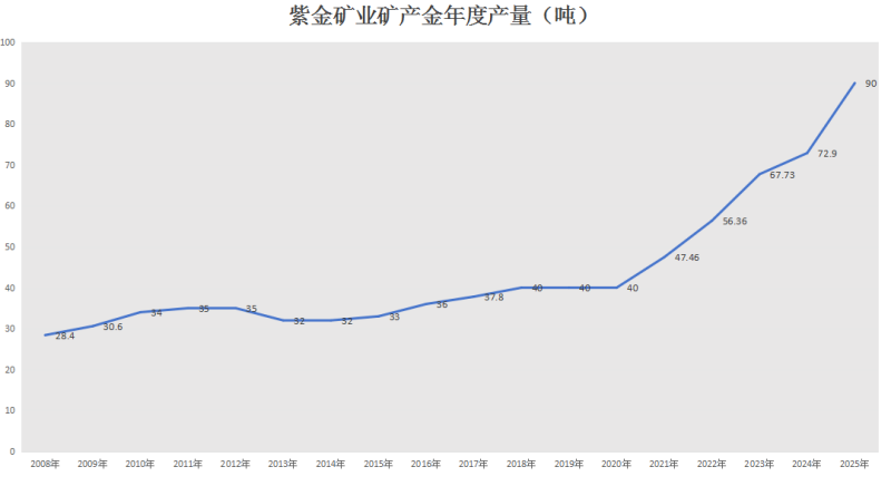 其次,是紫金礦業(yè)一直強(qiáng)調(diào)的“成長性”。2023年以來,公司礦產(chǎn)金迅速放量,由67.7噸增加至2025年的90噸,產(chǎn)量增速明顯高于銅產(chǎn)品,并在2025年成為公司利潤第一大來源。