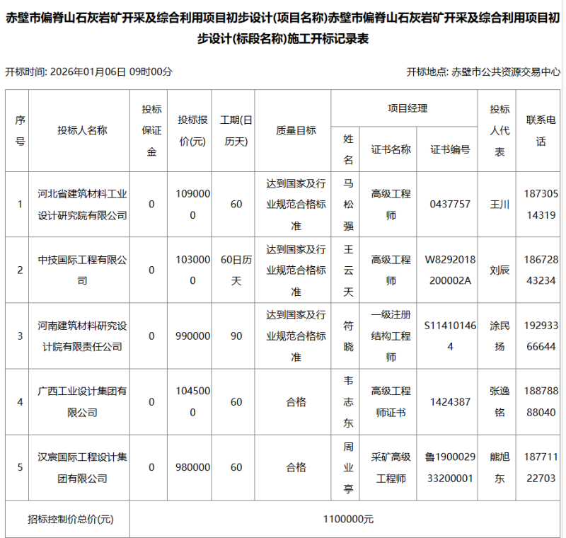 近日,全國公共資源交易平臺發(fā)布赤壁市偏脊山石灰?guī)r礦開采及綜合利用項目初步設(shè)計(標(biāo)段名稱)施工開標(biāo)記錄,共5家單位入選。
