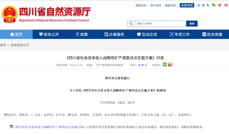 近日自然資源廳印發(fā)《四川省社會資本投入戰(zhàn)略性礦產(chǎn)調(diào)查試點實施方案》