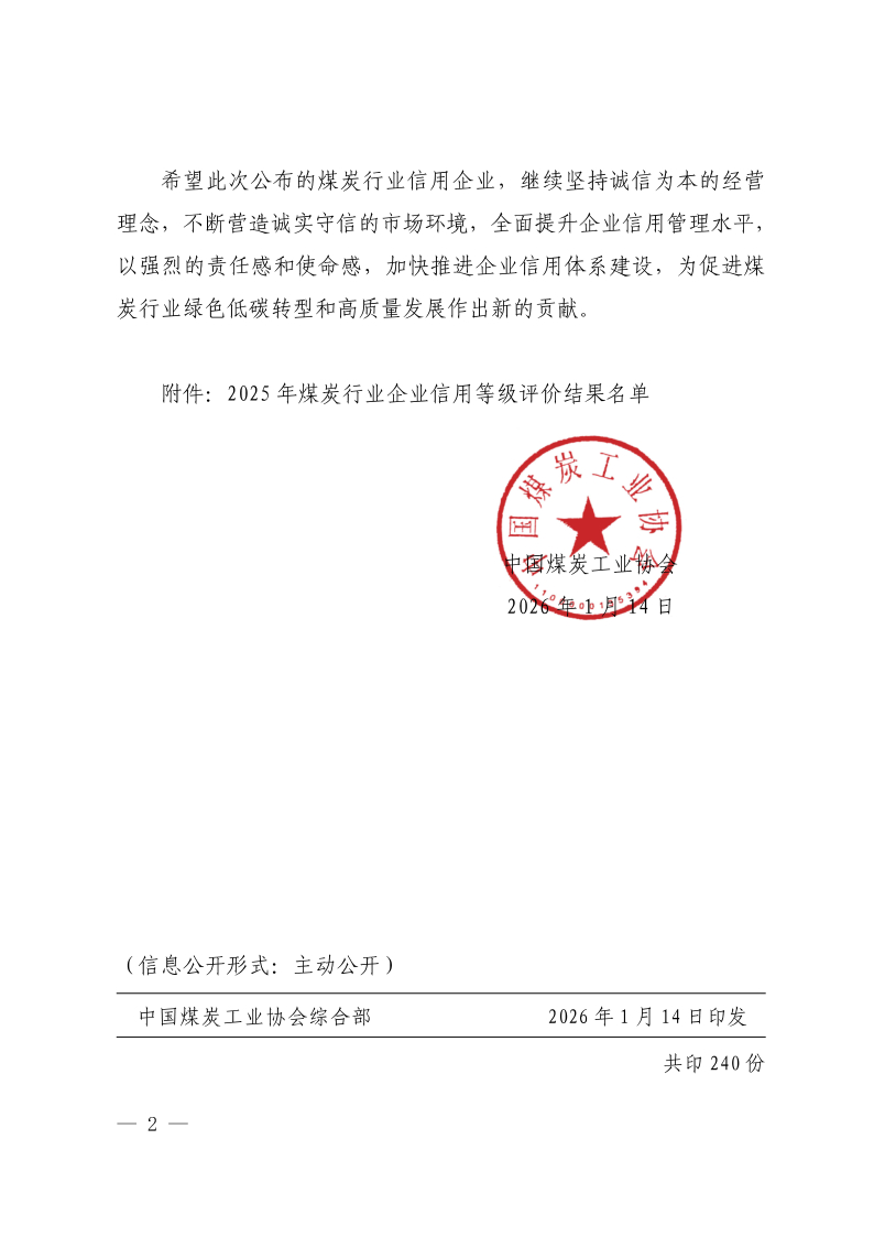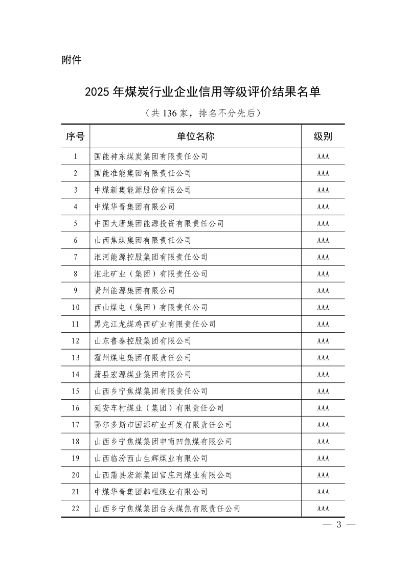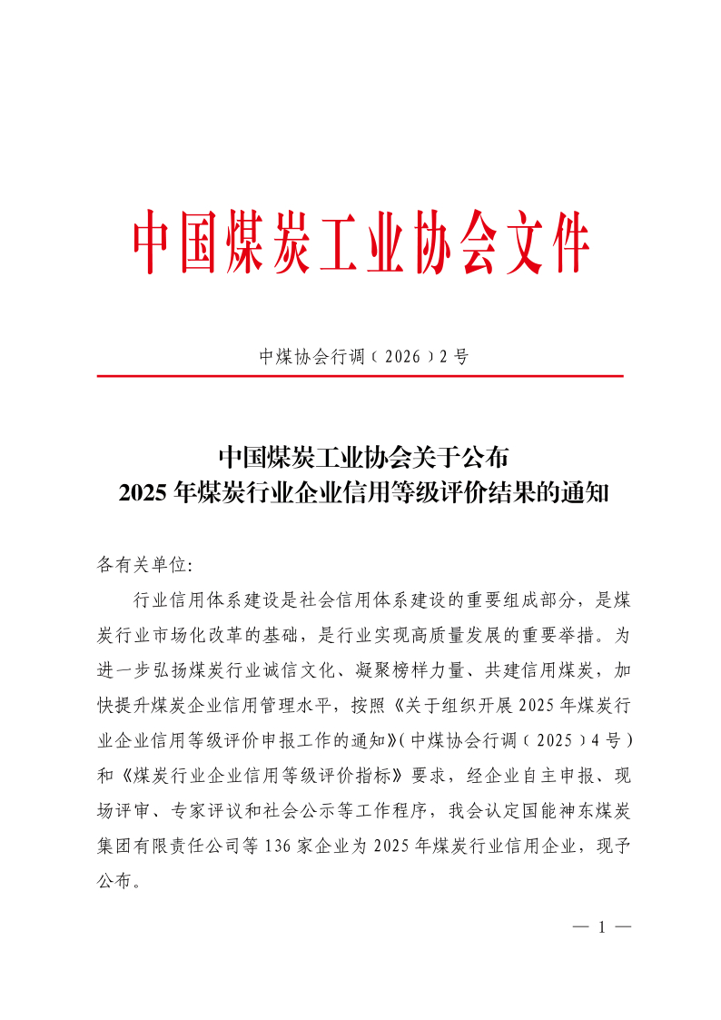 關(guān)于公布2025年煤炭行業(yè)企業(yè)信用等級評價結(jié)果的通知
