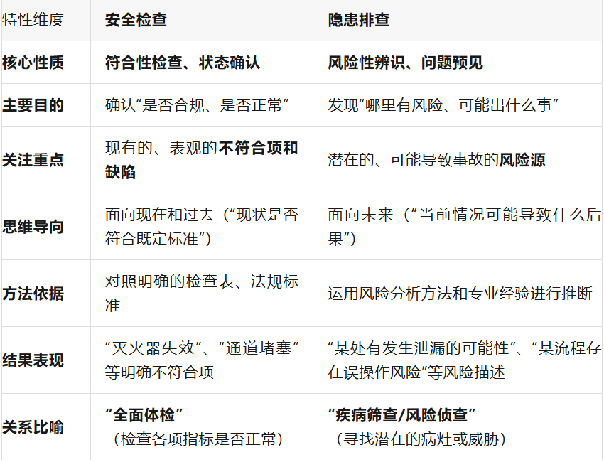 隱患排查 是指通過系統(tǒng)性的方法,主動識別生產(chǎn)經(jīng)營活動中存在的可能導(dǎo)致事故發(fā)生的 “隱患” 。隱患不僅指明顯的不符合項(xiàng),更側(cè)重于尋找那些“潛在的風(fēng)險點(diǎn)”。它更像是一個“疾病篩查”或“風(fēng)險偵查”。