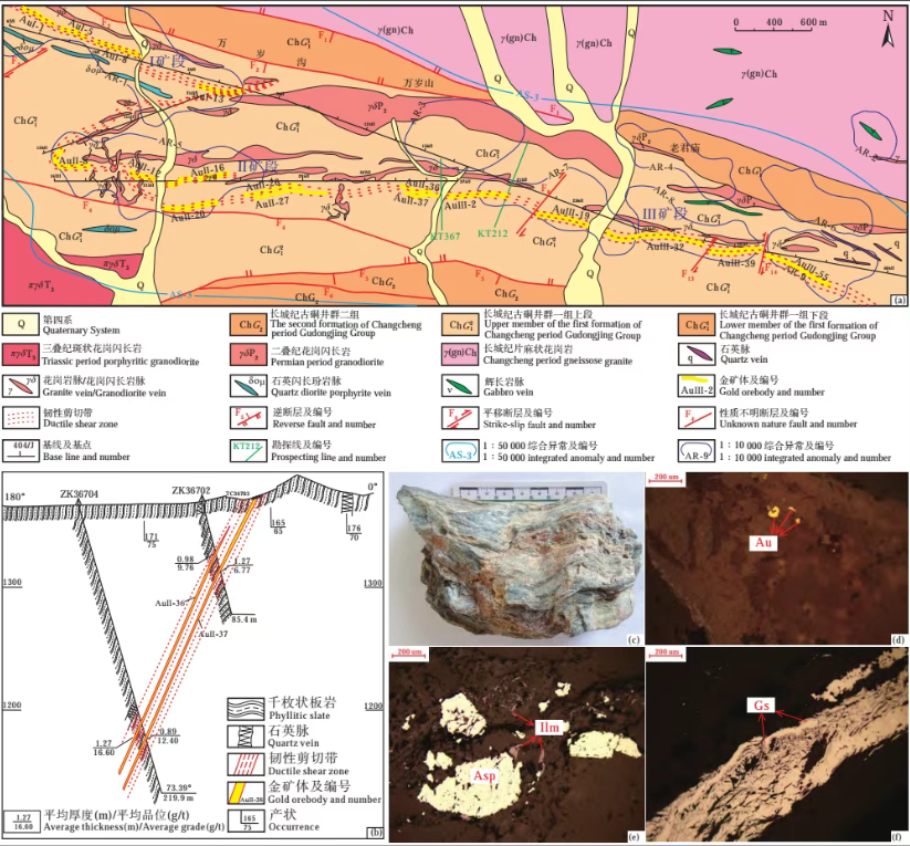 圖 1 前紅泉金礦地質(zhì)簡(jiǎn)圖 (a)、勘探線剖面圖 (b) 及礦石特征 (c~f)