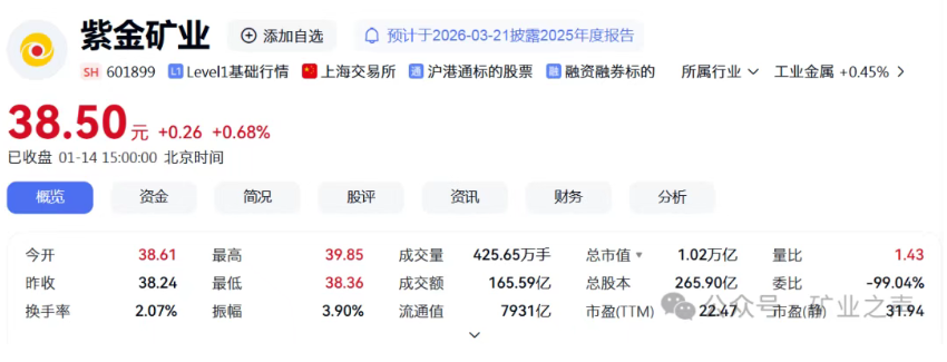 進(jìn)入2026年,受到短期金價(jià)反彈、倫銅新高的刺激,紫金礦業(yè)開年后的數(shù)個(gè)交易日每天都在創(chuàng)出新高。