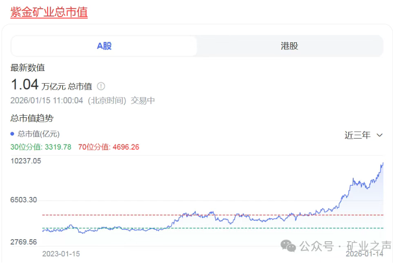 北京時(shí)間1月15日中午11時(shí),正在交易中的紫金礦業(yè)盤中市值1.04萬億元。
