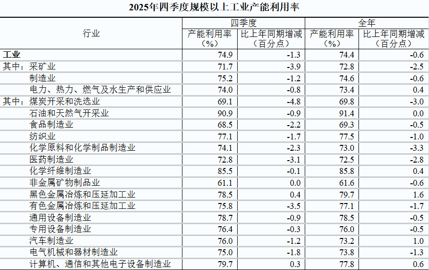 2025年四季度,全國規(guī)模以上工業(yè)產(chǎn)能利用率為74.9%,比三季度上升0.3個百分點,比上年同期下降1.3個百分點。2025年全國規(guī)模以上工業(yè)產(chǎn)能利用率為74.4%。