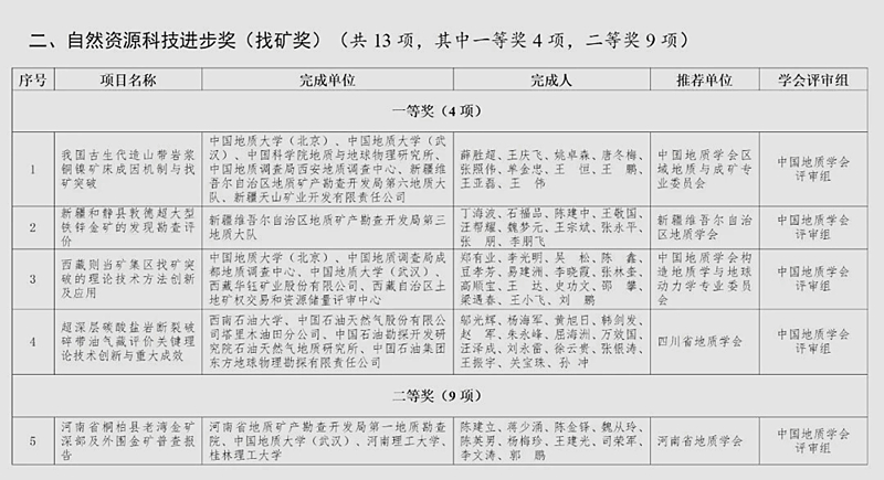 核心提示:自然資源部發(fā)布《2022年度自然資源科學技術(shù)獎獲獎成果公告》,共有獲獎成果137項,其中科技進步獎96項、找礦獎13項、青年科技獎2