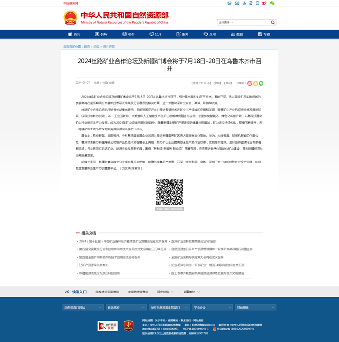 自然資源部:2024絲路礦業(yè)合作論壇及新疆礦博會將于7月18日-20日在烏魯木齊市召開
