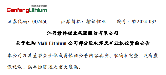 5月7日晚間,贛鋒鋰業(yè)發(fā)布公告,其全資子公司贛鋒國際擬以自有資金3.427億美元(約合人民幣23.6億)向Leo Lithium收購旗下Mali Lithium公司剩余40%股權(quán),收購?fù)瓿珊?,贛鋒國際將持有Mali Lithium100%股權(quán)。