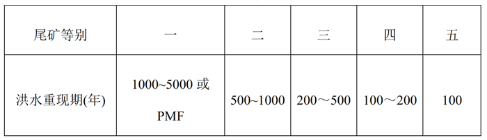 (1) 防洪標(biāo)準(zhǔn):尾礦庫各使用期的防洪標(biāo)準(zhǔn),根據(jù)使用期庫的等別、庫容、壩高、使用年限及對下游可能造成的危害程度等因素確定。