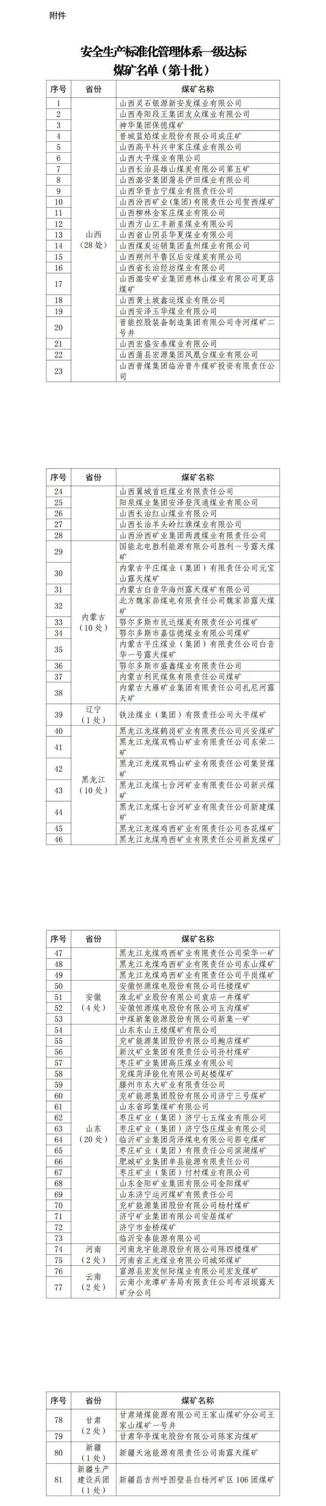 81處,安全生產(chǎn)標(biāo)準(zhǔn)化管理體系一級(jí)達(dá)標(biāo)煤礦名單公布!