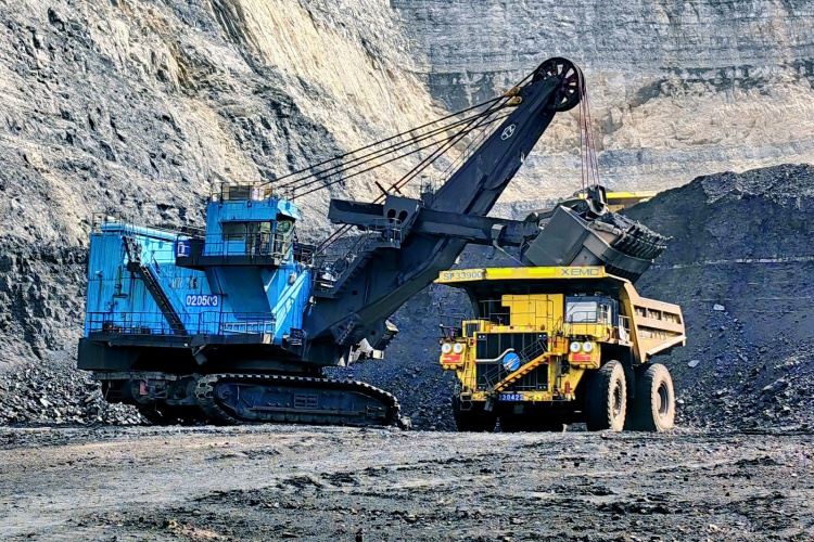 圖為黑岱溝露天煤礦電鏟為卡車裝載原煤