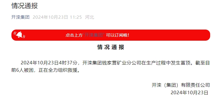 2024年10月23日4時37分,開灤集團錢家營礦業(yè)分公司在生產過程中發(fā)生冒頂。截至目前6人被困,正在全力組織救援。
