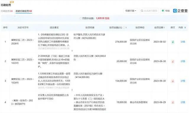 企查查APP顯示,開灤(集團)有限責任公司錢家營礦業(yè)分公司因安全相關問題,被有關部門罰款高達一千余萬元。今年6月,該礦因存在頂板等問題被罰33.8萬元。