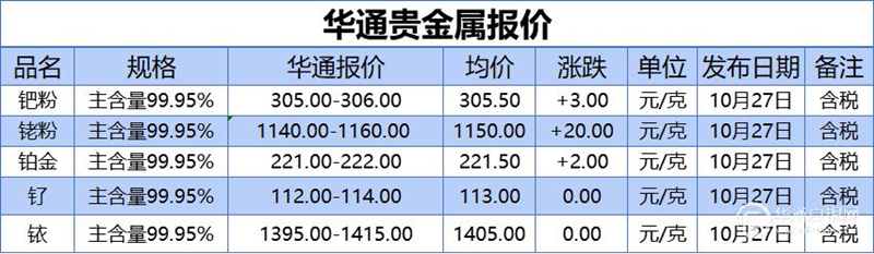 華通白銀網(wǎng) 10 月 27 日訊:鈀粉、銠粉、鉑金、釕、銥報價